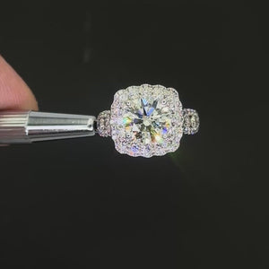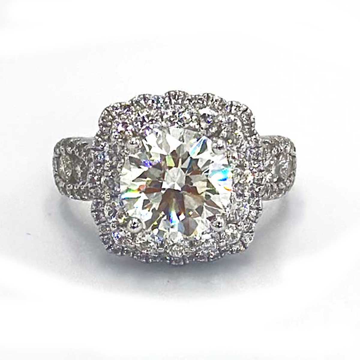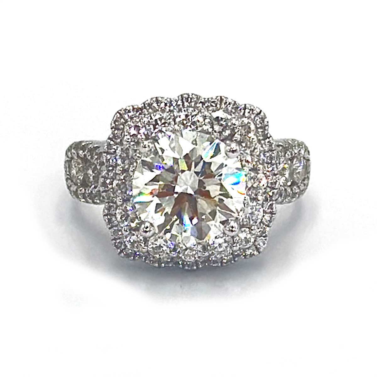 The ring features a 2.70ct Round Brilliant Cut Natural Diamond in a beautiful double layered halo mounting.