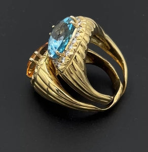 An exquisite 1980s design from famed Italian maker Sabbadini, this unique toi et moi puzzle ring is sure to be the talk of any event it is worn to.  The interlocked rings each feature a pear shaped gemstone - blue topaz in one and citrine in the other - surrounded by 20 round brilliant cut diamonds.  The colored stone weigh app. 4.00 cts. each, and the diamonds are F-G color and VS clarity, totaling app. 1.00 ct.  The ring is crafted in 18kt yellow gold and weighs 21.8 grams.  It is a size 5 but because of the design, sizing will be very limited.