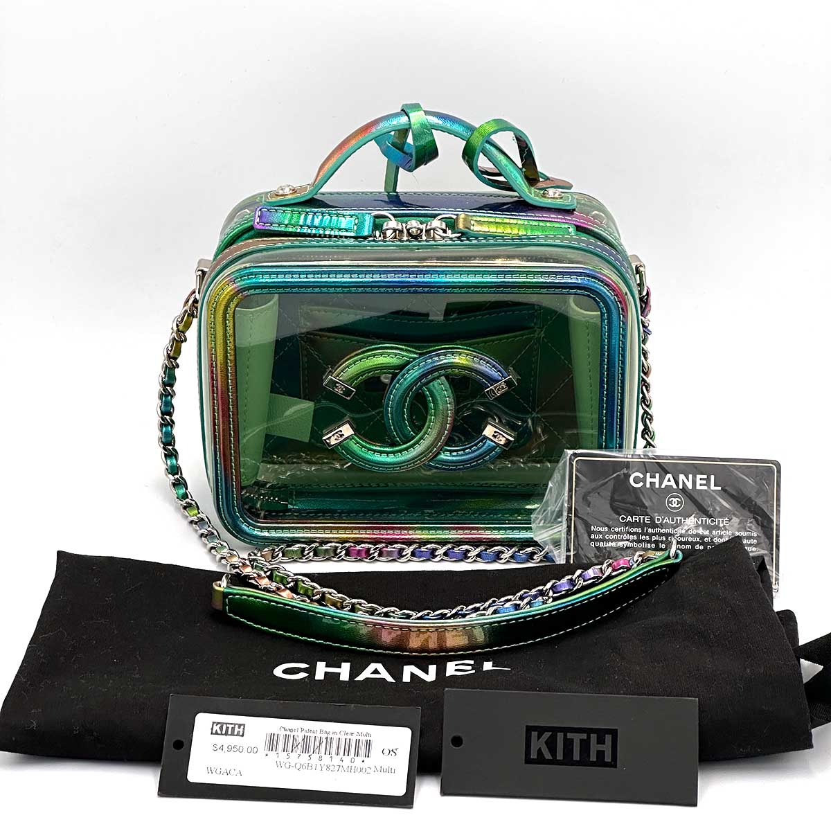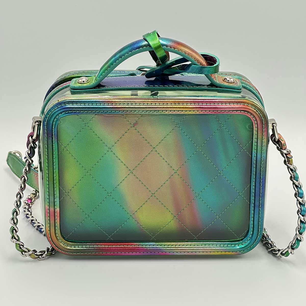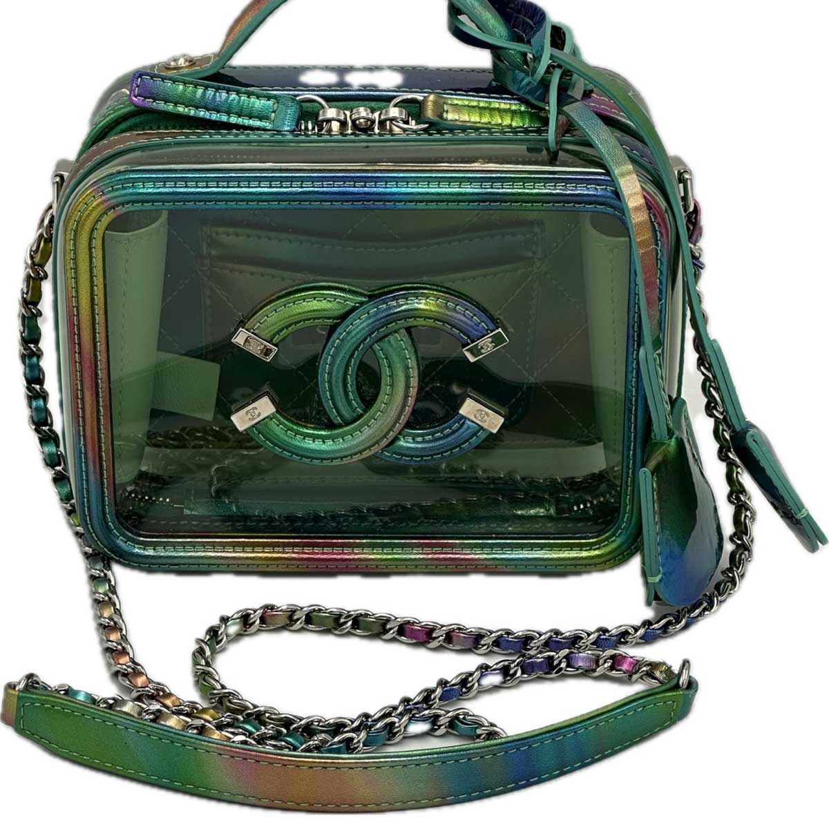 -This Chanel PVC Patent bag, with green toned transparent pvc, as well as patent lambskin, is an absolute statement! With pops of color along with its easy to carry functionality, this is the bag for someone who wants all of the attention! With that attention, you'll get added security with a convenient lock mechanism!